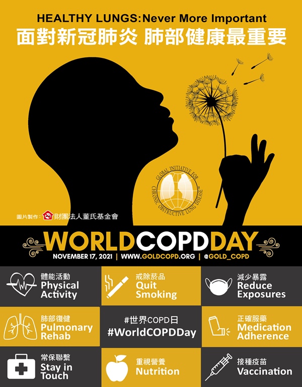 全世界有3億人受COPD(慢性阻塞性肺病,俗稱「肺氣腫」)所苦[1],據世衛組織(WHO)資料,COPD是全球第三大死因,2019 年造成323萬人死亡[2];在台灣COPD則為國人第八大死因[3],一年有超過5千人因COPD死亡[4]。9成COPD患者是「吸菸」引起,因此2021年的「世界COPD日」全球推動主題為「肺部健康最重要」,提醒防治新冠肺炎變種病毒疫情,更要戒菸、戒電子煙,用護肺8招遠離COVID-19、對抗COPD、保護肺部健康。