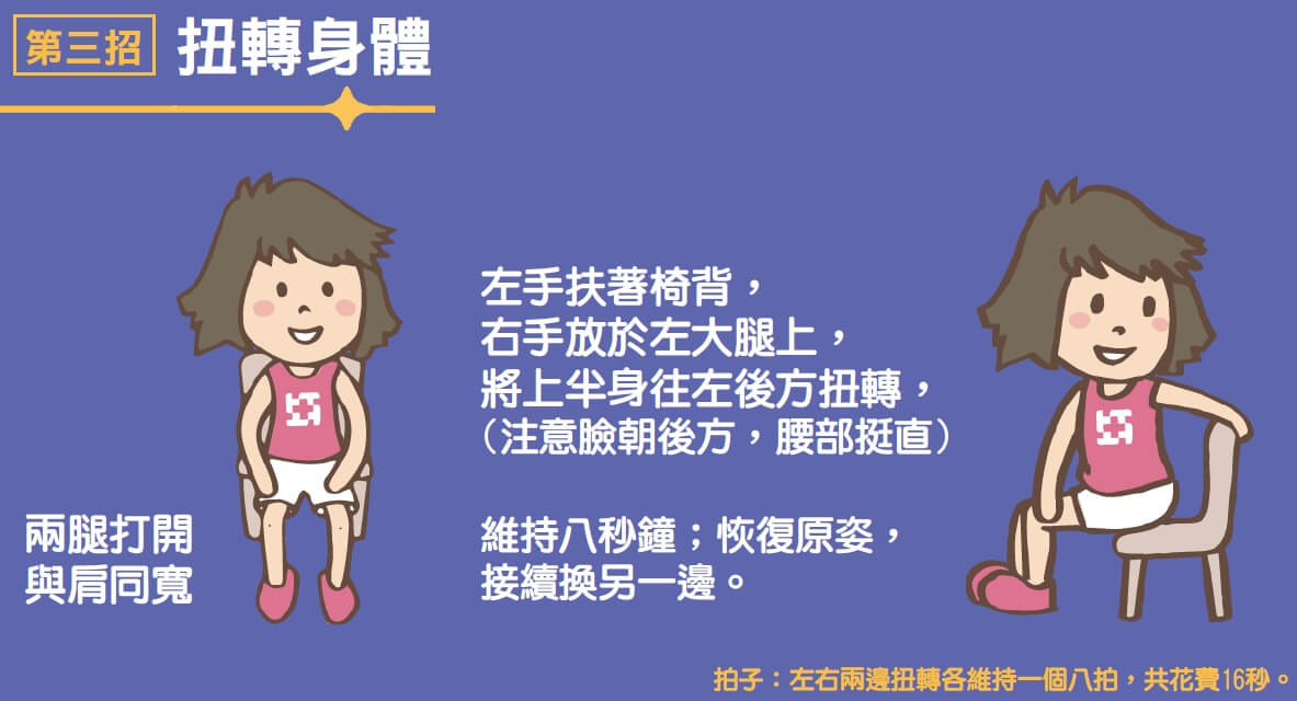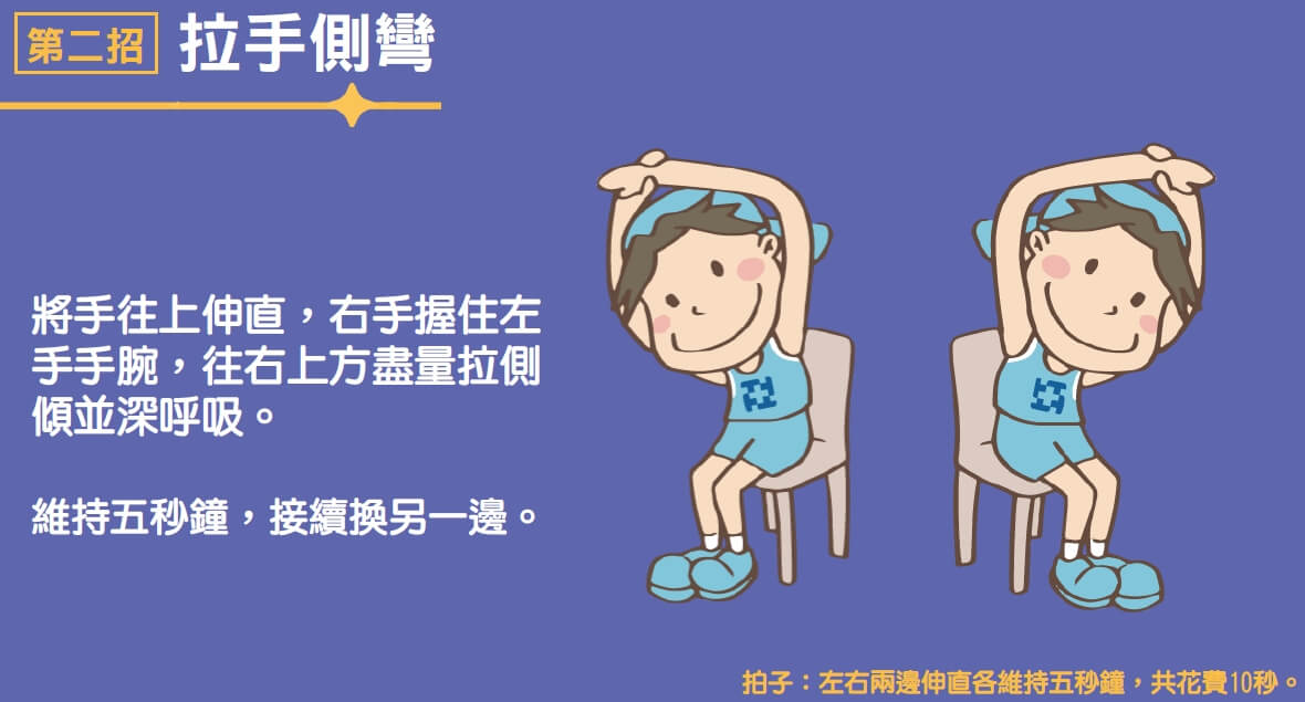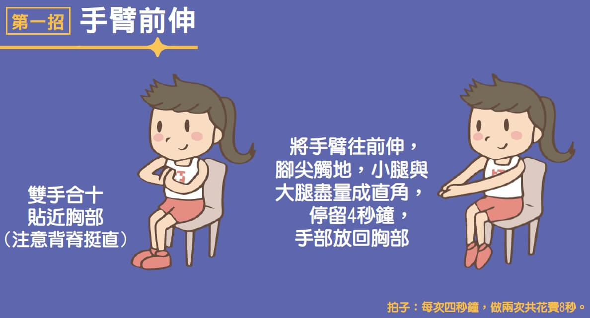 葉雅馨說,上述研究結果均顯示身體活動量的改變會影響兒童青少年的心理健康。她提醒,除了樂動紓壓五招之外,董氏基金會也特別因應改善久坐習慣,設計一分鐘紓壓伸展操:「手臂前伸」、「拉手側彎」、「扭轉身體」、「左右蹬腳」、「左右平移」,便利又簡單!建議大家做為疫後運動的應用參考日常生活中就可以應用,像是下課時間或是午休起床後做個一分鐘,伸展肢體也能醒醒腦。