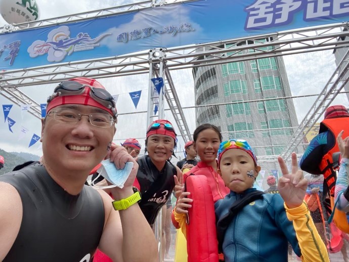 圖說:蔡依玲分享,跟著團體一起運動,有助提升動力、堅持運動習慣。圖為他和一群家長帶著孩子,一起挑戰泳渡日月潭。