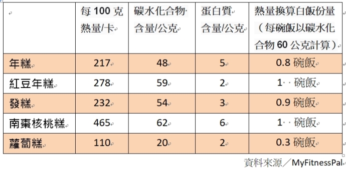 如果正餐時想吃寧波年糕、韓國年糕、蘿蔔糕、發糕等米製品,夏子雯營養師建議,年糕類一次食用6~8小塊、或發糕1顆是可接受的範圍,蘿蔔糕4片熱量將近1碗白飯。