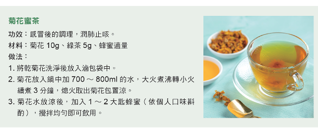 3.菊花水放涼後,加入1~2大匙蜂蜜(依個人口味斟酌),攪拌均勻即可飲用。(延伸閱讀:天氣一冷就感冒,冬日食療聰明吃)