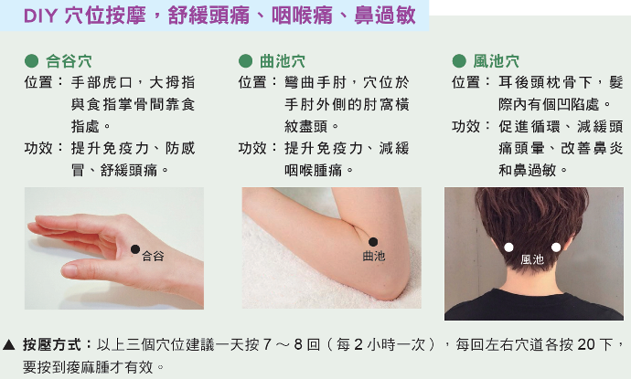DIY穴位按摩,舒緩頭痛、咽喉痛、鼻過敏