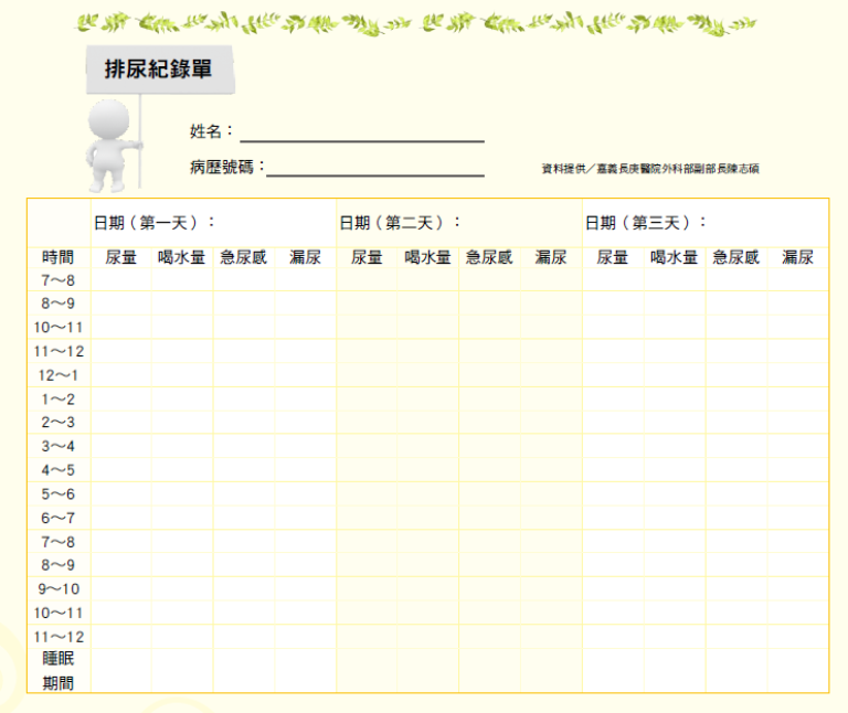 如果真的有夜尿問題,建議在睡前3、4小時,就不要再喝水,如此可減少夜尿的發生。平時也可試著撰寫「排尿日誌」,詳實記錄自己的喝水量、排尿量。