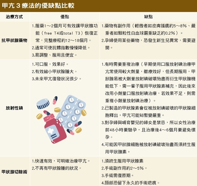 哪些情形需換藥?服用抗甲狀腺藥物約5%會出現皮膚搔癢的過敏反應,此時可給予抗組織胺治療,如果情形無法改善,可考慮更換抗甲狀腺藥物。一般甲亢患者較少接受放射碘治療或手術,陳瑞鴻醫師表示,這兩種方法大多用於毒性多發結節性甲狀腺或毒性甲狀腺腺瘤導致甲亢的患者。