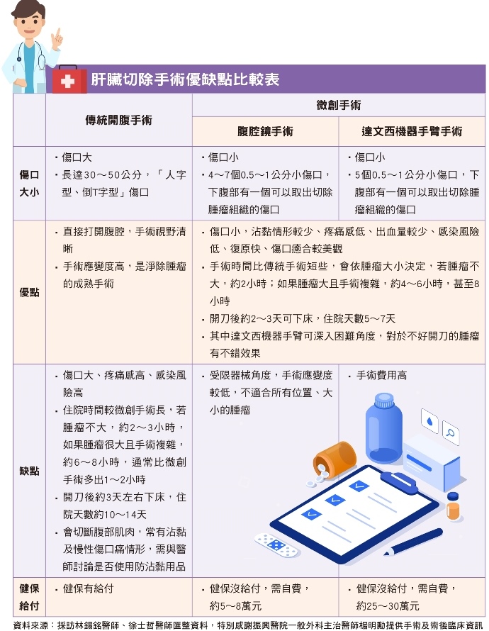 站在醫師角度,傳統開腹的開口較大,執刀醫師觀察病灶的視野相對清晰,也可以透過手感觸摸到肝臟,切除過程中能夠因應腫瘤狀況,隨時調整手術進程,已是淨除腫瘤的成熟手術,是優先考慮使用的切除手術。