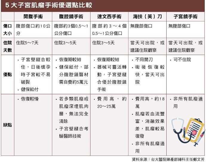 現今保留子宮的子宮肌瘤手術有開腹、腹腔鏡、達文西、子宮鏡和海扶(芙)刀。