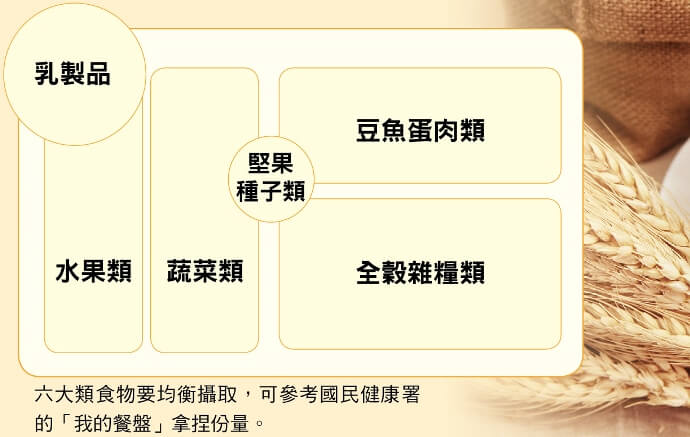 化療前盡量均衡飲食,六大類食物都要攝取足夠,患者可參考國民健康署推出的「我的餐盤」及口訣,幫助記憶各類食物的分量及比例。