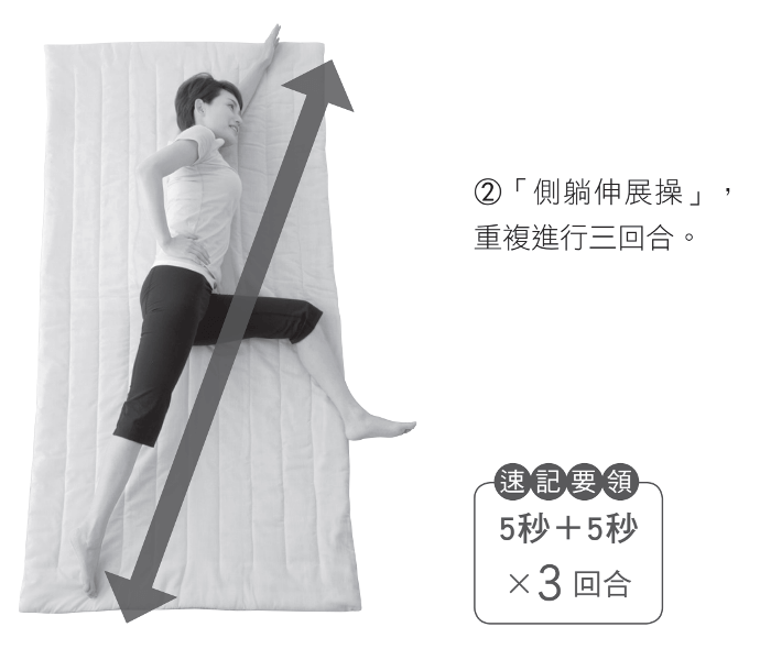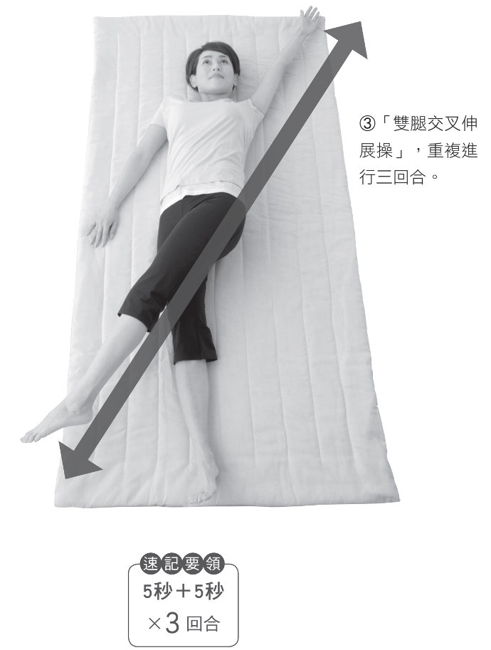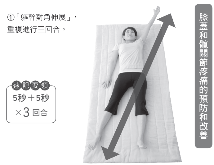 進行「軀幹對角伸展」、「雙腿交叉伸展」、「側躺伸展」這三式動作,能確實鍛鍊連接脊椎的背部肌肉、連結骨盆的臀部肌肉,也包括大腿正面、側面及內側肌肉等,將減輕膝關節和髖關節的負擔,關節活動範圍也會變大。(延伸閱讀:吃維骨力,能改善膝蓋痛,為關節存健康?)