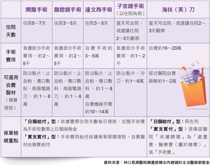 切除子宮肌瘤目前有5種手術可選擇,費用從千元到數十萬元皆可能,有些健保給付、有些需自費,除了和醫師討論,選擇適合的手術外,經濟考量也是評估項目。林口長庚醫院婦產部婦女內視鏡科郭信宏醫師,以門診患者常問的醫療保險理賠問題,提醒術前須釐清的細節。
