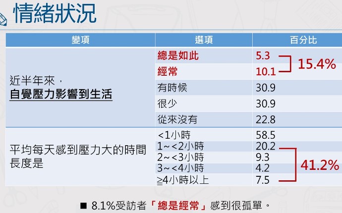 董氏基金會心理衛生中心主任葉雅馨說明,於2021年9~11月以全台國高中職生為對象進行的「人際關係、壓力及憂鬱情緒現況」的調查,有效問卷2,607份,結果發現,有15.4%的青少年常感受到壓力,影響自身的生活;有41.2%的青少年每天感到壓力大的時間超過1小時;8.1%常覺得自己很孤單。(延伸閱讀:孩子焦慮是青春期煩惱 還是有心理困擾?超過半數父母難辨識!)