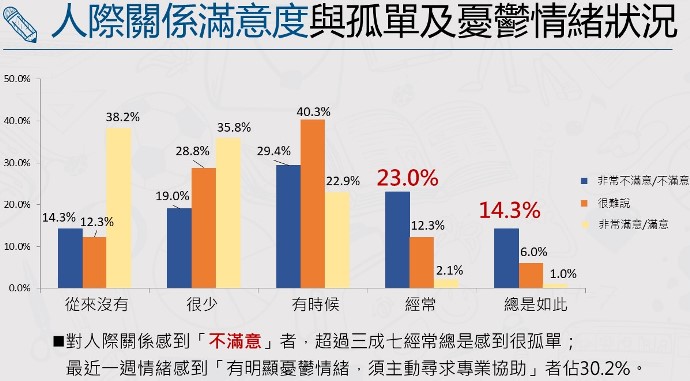 進一步分析發現,受訪者對於人際關係感到「不滿意」者,近半年常感受到壓力而影響自身生活者,占36.2%、「覺得自己很孤單」者占37.3%,以及最近一週情緒感到「有明顯憂鬱情緒,須主動尋求專業協助」者占30.2%,均明顯高於對人際關係感到非常滿意者。(延伸閱讀:憂鬱症年輕人未接受治療,近四成不知向何處求助!)