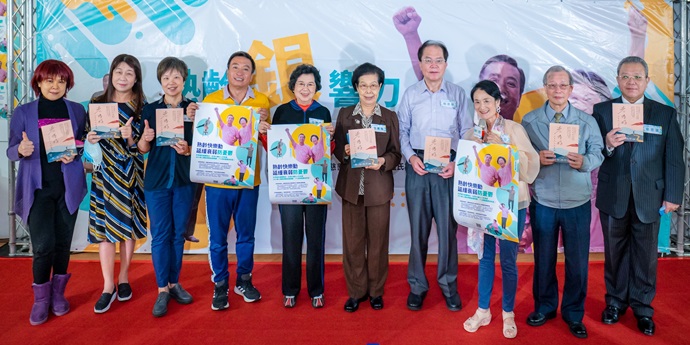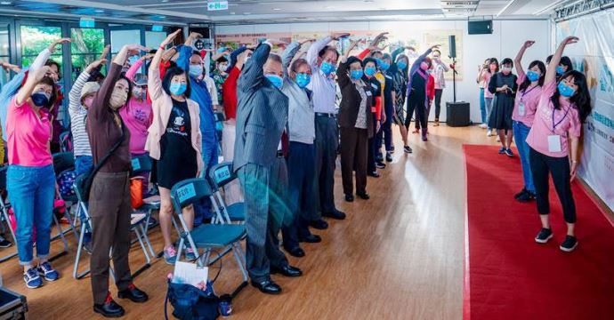 記者會現場超過70位中高齡者出席響應,並跟隨樂齡阿嬤王滿嬌與樂活大叔王中平觀看「熟齡運動紓壓」影片,共同進行紓壓放鬆運動,號召中高齡民眾,每天動一動,快樂又紓壓。