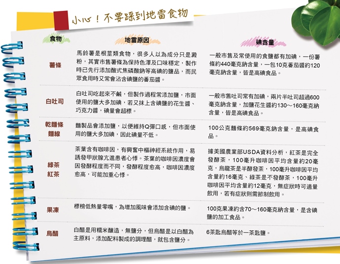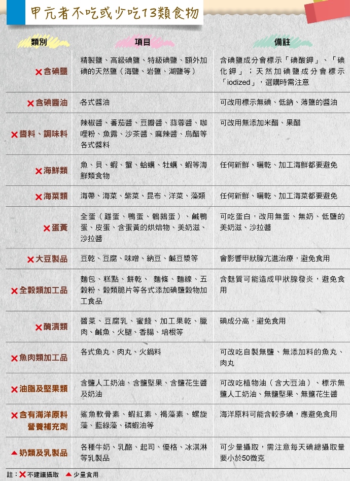 甲狀腺亢進患者建議食用無碘鹽或低碘食鹽,購買時,需查閱營養標示。