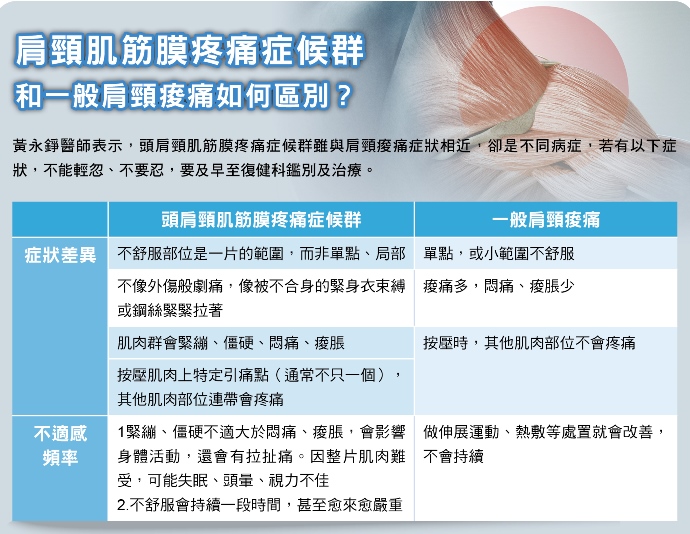 黃永錚醫師表示,頭肩頸肌筋膜疼痛症候群雖與肩頸痠痛症相近,卻是不同病症,若有以下症狀,不能輕忽、不要忍,要及早至復健科鑑別及治療。