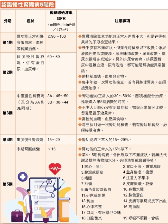 2. 開始就醫後要盡量獲得精準治療。腎臟病從第一到第五期的療法差異大(詳見文末【認識慢性腎臟病5階段】表格),針對患者的個別狀況,療法也須調整,這都需要患者、醫護共同配合,以達到精準的治療。