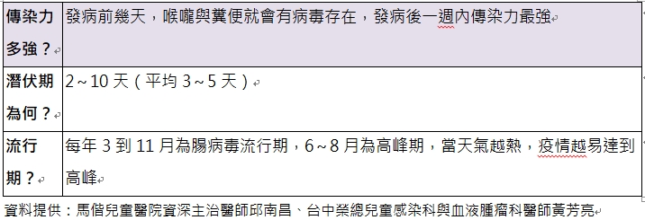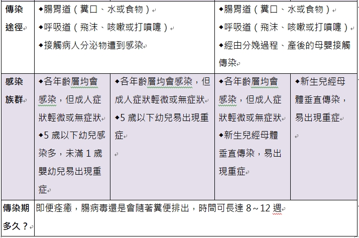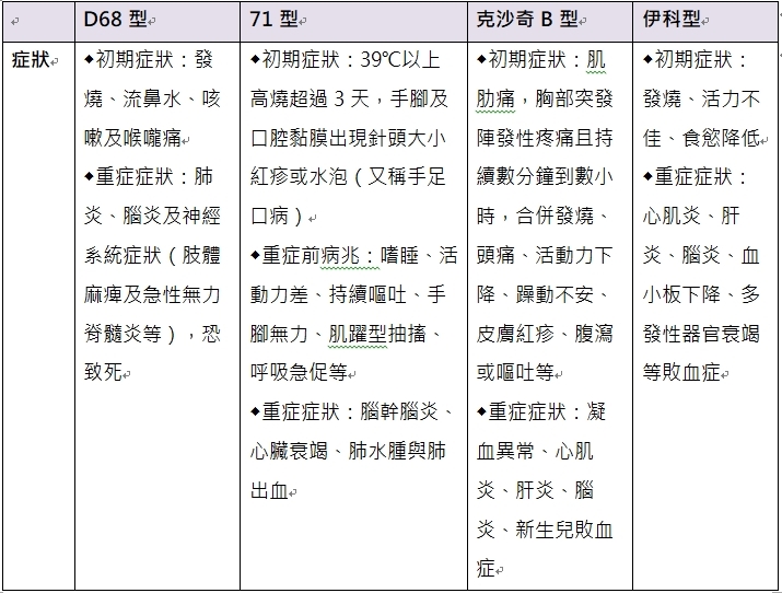腸病毒感染是幼兒常見疾病,腸病毒包含一群病毒,如小兒麻痺病毒、克沙奇病毒、伊科病毒及腸病毒等種類,每個類別又可細分為多種型態。腸病毒約90%會自癒,其中會導致重症的腸病毒是71型、D68型、伊科病毒等。