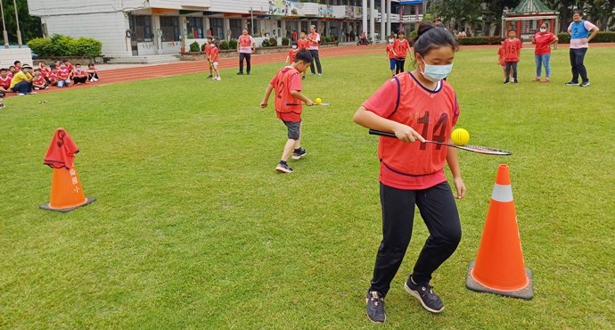 同學進行趣味遊戲,各隊同學努力向前跑,考驗平衡感及速度。