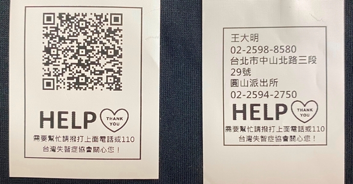 陳筠靜說,愛心布標材質耐洗,上面印有愛心圖樣及HELP字樣,可選擇「文字版」或「QR Code」版,前者直接印有失智家人的連絡資訊,後者需透過手機掃碼才能看到連絡資訊,但可容納更多信息。愛心布標可向台灣失智症協會申請,初次申請可免費索取20張,超過20張,則自由樂捐補助製作費。