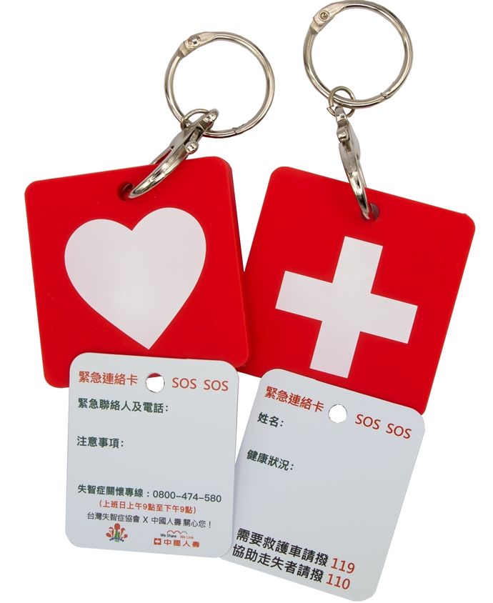 緊急連絡卡採用去標籤的設計,外觀是可愛的吊牌。陳筠靜說,緊急連絡卡內可填寫配戴者的姓名、健康狀況、注意事項及緊急連絡人電話,可掛在包包上使用。