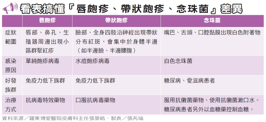 若常嘴破、嘴巴長水泡,當心感染皰疹病毒!感染唇皰疹要避免親吻、親臉,以免傳染。若紅疹、水泡不只嘴邊,也發生在身體,會發癢、有觸電般刺痛,恐是帶狀皰疹(皮蛇)。一表搞懂「唇皰疹、帶狀皰疹、念珠菌」症狀及治療方式,及早治療更快好!