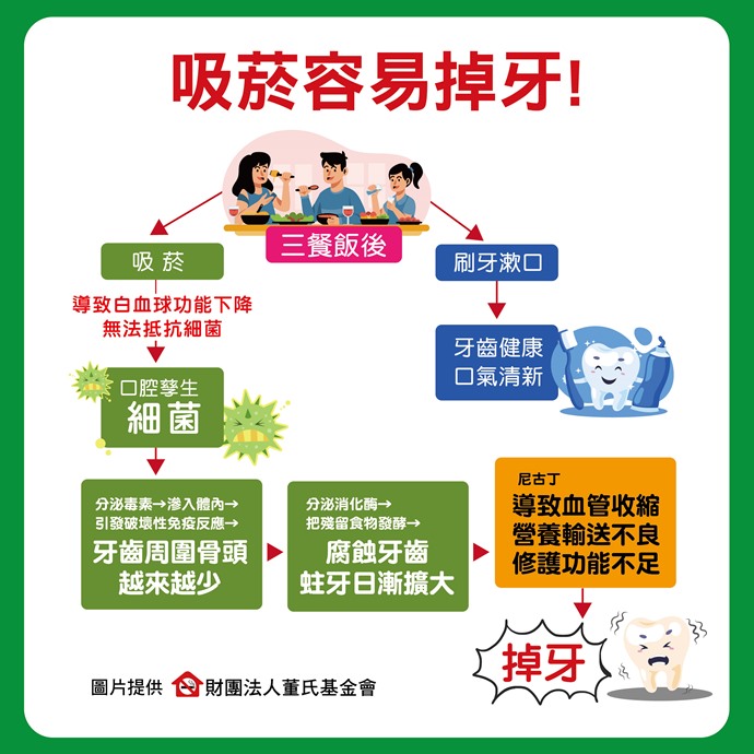 陳時中指出,多數癮君子飯後不是花時間去刷牙或漱口,而是把時間拿去吸菸,這樣會加速致病菌的生長速度,使得牙齒周圍骨頭越來越少,牙齦越來越低,最終導致牙齒鬆動;而且細菌代謝產生的「酸」還會腐蝕牙齒,讓蛀牙日漸擴大!加上菸品中的尼古丁不僅會讓白血球防禦功能下降,無法抵抗細菌侵蝕,還會使血管收縮,營養輸送不良、修護能力不足,導致牙周組織潰散……,這就是吸菸導致掉牙最主要的原因!