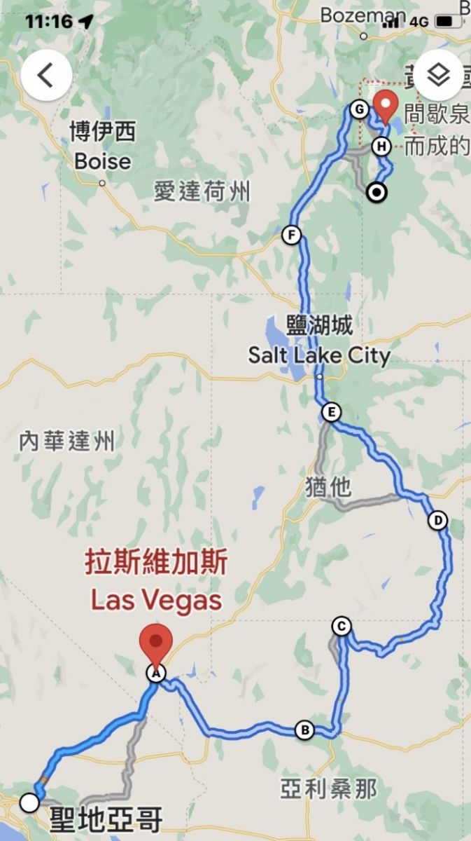 一聽到解封消息,我馬上著手安排再訪黃石公園的旅程,而三年前確認的人、事已然不同;想留宿的老忠實旅店被搶訂一空,我們只能租露營營地,原定共同出遊的八位朋友,只有兩人今年可再同行,最後成行的也只剩下九人。此行從加州的安大略出發,途經拉斯維加斯一路東行、再往北過鹽湖城,到達最終目的地黃石公園,我們開了1500英里,來回就要3000英里。