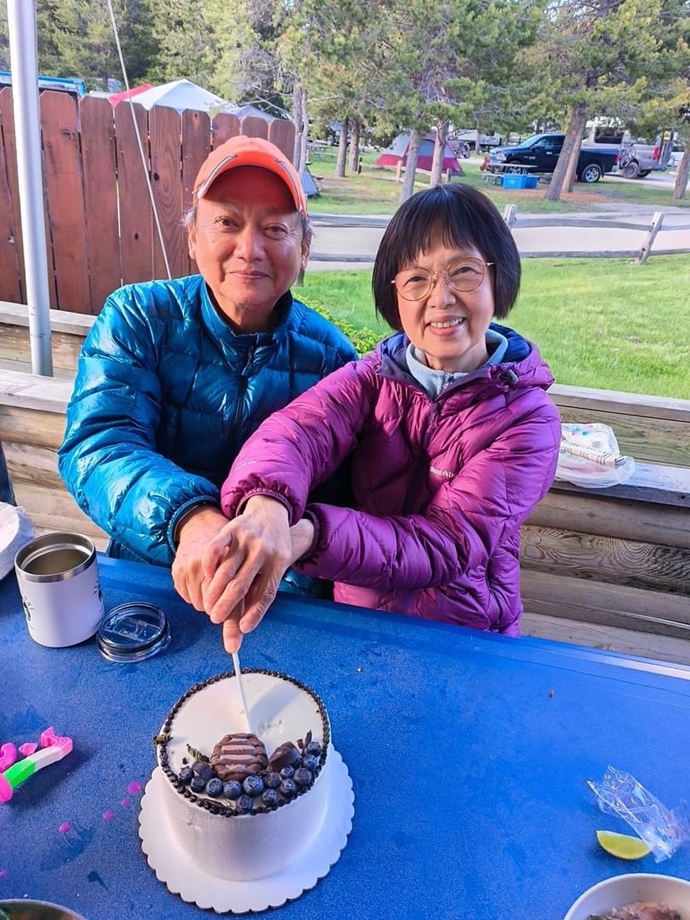 ▲在KOA露營場的戶外餐桌,朋友買了蛋糕幫我過73歲的生日。