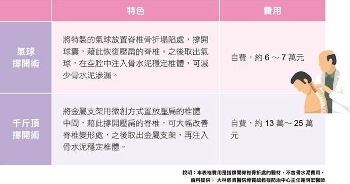 現階段新式療法是「經皮骨水泥椎體成形術」,是一種微創手術,依據脊椎塌陷程度有三種手術可選擇,若塌陷程度較低的患者,適用「低溫骨水泥椎體成形術」,若塌陷程度較高的患者,可用「氣球」及「千斤頂」這兩種醫材先「撐開錐體塌陷處」,之後再注射骨水泥(見表1)。