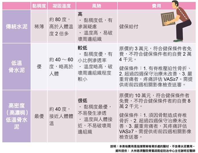 治療脊椎壓迫性骨折的骨水泥發展30年以上,傳統水泥價格低,健保有給付,而脊椎椎體成形術中使用的專用骨水泥有兩類,一是低溫骨水泥,二是高密度(高濃稠)低溫骨水泥,要符合條件,健保才給付,三種骨水泥各有優缺點,治療前需詳細瞭解(見表2)。(延伸閱讀:愛吃清粥小菜增肌少症、失能危機?3招避免增脂肪、減肌肉!)