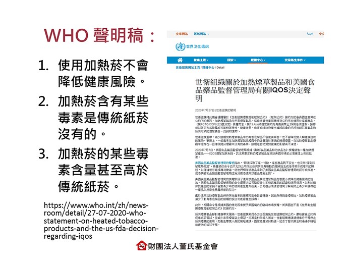 為凸顯與警示加熱菸的危害與風險,世界衛生組織(WHO)日前更首度發表「加熱菸健康影響報告書」,直批加熱菸運用減害的誤導性宣傳。WHO報告明確指出「加熱菸霧中有『22種有害化學物質含量超過紙菸的200%』,有『7種有害化學物質含量甚至超過1000%』」〪