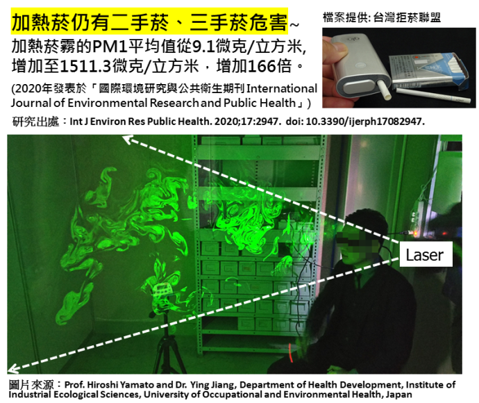 義大利研究也發現,室內加熱菸霧懸浮微粒數值PM1的平均值,從9.1微克/立方米增加至1511.3微克/立方米,增加了166倍,均證實加熱菸有二手與三手菸的危害。