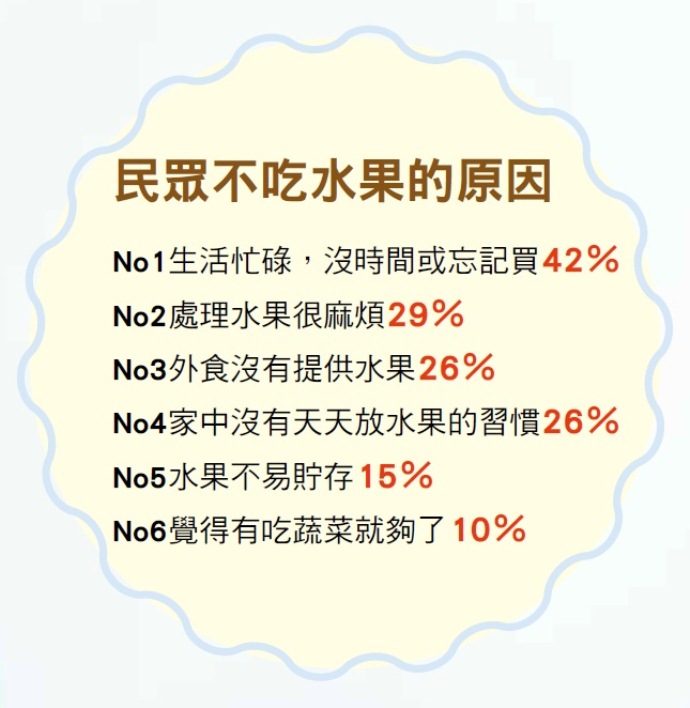 董氏基金會公布國人「2015年身體快樂訊息」大調查,發現民眾雖然懂得為健康挑著吃,但全台有88.6%民眾吃不到衛生福利部建議的每天2份水果,甚至有一成民眾以為「吃蔬菜就夠了!」不在乎水果攝取、不健康的生活型態,讓臺灣人身體快樂不起來!臺灣民眾身體快樂總平均只有63分,36%不及格,普遍覺得不夠快樂。