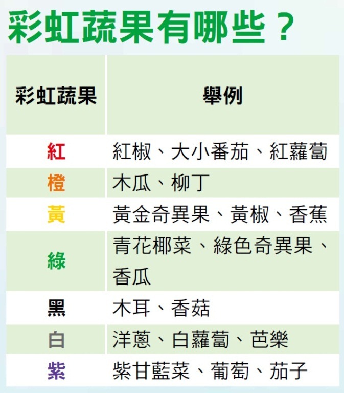 董氏基金會食品營養組營養師呂蕙如提醒,要讓身體快樂,可依紅橙黃綠黑白紫的彩虹快樂蔬果,選擇當季、互相搭配,如此可廣泛攝取設膳食纖維、多種多酚、維生素、礦物質以及營養素,例如:膳食纖維、茄紅素、葉黃素、花青素、槲皮素、葉酸、抗氧化物……等。最重要的是,每天2份基本水果分量別忘囉!