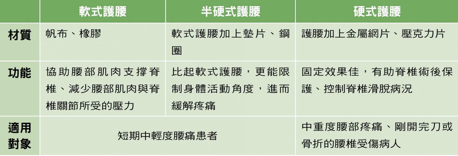 坊間護腰多樣,依內置材質可分軟、半硬、硬式三大類。「軟式護腰」整體純為帆布、橡膠等軟性質料,主要是透過緊壓方式提供腰部包覆,協助腰部肌肉支撐脊椎、減少腰部肌肉與脊椎關節所受的壓力,並限縮關節活動,進而達到緩解疼痛的效果;在軟式護腰中加上額外的墊片、鋼圈則成「半硬式護腰」,上述兩者適合中輕度腰部疼痛患者;至於「硬式護腰」,則會添加金屬網片、壓克力,適合中重度腰部疼痛、剛開完刀或骨折的腰椎受傷病人。