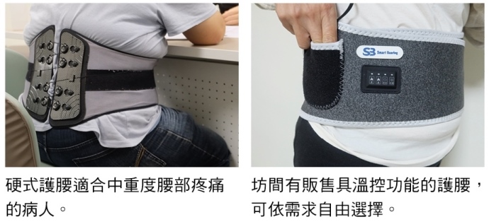 挑選護腰時,建議先諮詢醫師或專業人員適合的款式;若是不確定自己的腰痛程度,何政哲建議,可依受影響的動作來分辨,像有病人說自己「幾乎無法翻身、走路都會痛」,症狀嚴重,就建議使用硬式護腰。