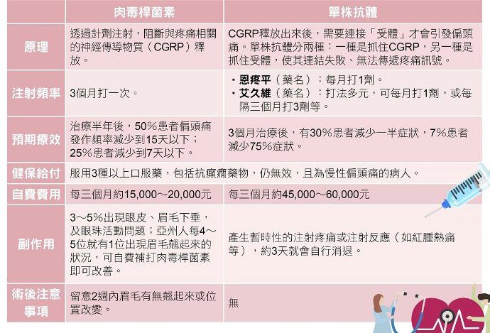 當氣溫下降,婉真的偏頭痛幾乎天天發作、嚴重影響生活。醫師表示,慢性偏頭痛並非只能吃藥治療,健保針對頑固型偏頭痛有條件給付「肉毒桿菌素與CGRP單株抗體」,以下簡介其療效、費用、注意事項,幫你告別偏頭痛。