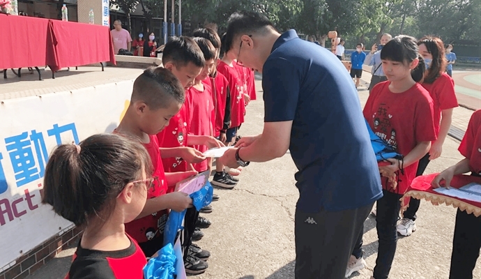 活動中安排嘉賓、師長及同學進行趣味競賽,透過傳接球遊戲展現團隊合作默契,感受運動帶來的幸福感,並頒發鼓勵狀與獎勵品給前半學期認真跑步與跳繩做公益的同學,活動最後兩校師長帶領全體師生、企業及基金會代表們共同慢跑操場一圈,展現孩子們滿滿的熱情與活力。