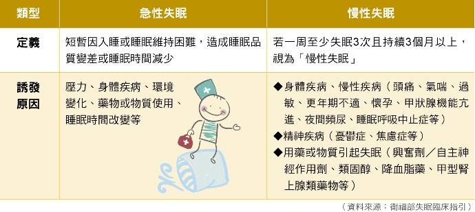 睡眠充不充足短則影響隔日精神,長期影響整體身心健康與生活品質。若一周至少3次失眠且持續3個月以上,視為「慢性失眠」。中山醫學大學精神科兼任教授、德仁診所賴德仁醫師說明,慢性失眠可能誘發如憂鬱、焦慮、藥物依賴等精神疾病和心肺系統的內科身體疾病,老年人的慢性睡眠問題也會引起注意力障礙、短期記憶困難、反應時間增長,更可能會出現認知缺損。(延伸閱讀:晚上睡不好,白天坐著老打瞌睡,不是正常老化?)