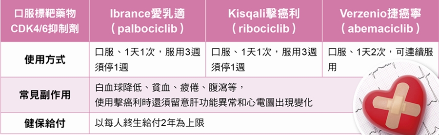 目前已核准並納入健保的三個CDK4/6抑制劑,分別是Ibrance愛乳適(學名palbociclib)、Kisqali擊癌利(學名ribociclib)、Verzenio捷癌寧(學名abemaciclib),都是口服型的小分子標靶藥物,適用於局部晚期或轉移性乳癌。最新研究顯示,捷癌寧亦可有效降低早期乳癌患者復發風險,因而今年3月起也納入健保給付,但須同時具備以下條件: