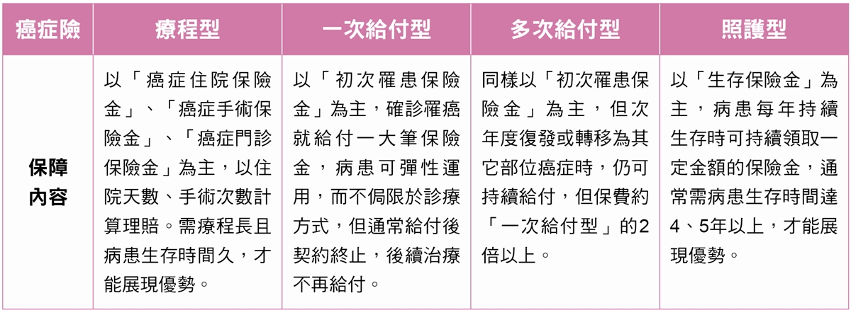 市面上癌症險可分為「療程型」、「一次給付型」、「多次給付型」、「照護型」等類型(見附表),專家建議優先購買「一次給付型」癌症險,確診罹癌就可獲得一大筆保險金,方便彈性運用,對癌症初期積極治療階段,能更有效填補高額醫療花費的經濟支出。