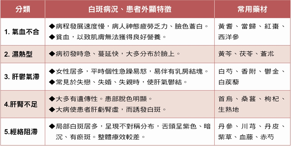 聶美華中醫師說,白斑看似一種皮膚病,實際上是屬於「內臟病」,詳細的成因、機轉就中醫角度來分類可達60多種。以下是由內臟的運作來概分的五大類白斑型態,各有不同的病程特色跟常用藥材: