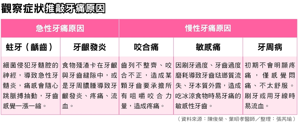 若確定牙痛原因來自口腔,則需進一步釐清牙痛發炎部位,牙痛依據發作性質可分為急、慢性。急性牙痛成因可能是蛀牙(進展至牙髓炎、根尖周圍炎)、牙齦發炎,慢性牙痛可能來自咬合痛、敏感性牙齒與牙周病。(延伸閱讀:不到30歲就有牙周病?小心侵犯型牙周病)