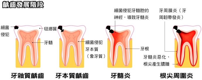 蛀牙引發牙髓炎,再導致根尖周圍炎,是一連串的疾病進展,若沒有在第一時間治療阻擋,可能一步步惡化。陳俊榮醫師表示,牙醫師會透過問診、檢查做出判斷,決定適當的治療,例如清掉蛀牙處再補牙或根管治療。(延伸閱讀:國人65歲後只剩18顆牙 不想掉牙該知道的7件事)