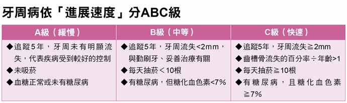 在治療牙周病時,也會考量進展速度的分級(Grading)。徐振祥醫師指出,如果牙周病患者是在第一期、A級階段,有很多治療選擇,藉由健保型治療就能控制下來;但若是在第二期、B或C級階段,僅透過健保型治療的壓力就會比較大;一旦進入較嚴重的第三、四期,此時健保能夠提供的治療資源十分有限。