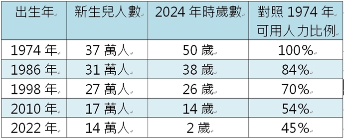 台灣現今少子化與高齡化的問題,人口結構出現急劇變化:我出生那年(1950),有42萬多名新生兒報到,24年後的虎年(1974)新生兒有37萬人,再過24年的虎年(1998)新生兒降至27萬人,到了2022年,新生兒只剩下14萬人。人口結構變化會直接影響各行各業的人力供需,人力缺口在各行各業都會發生,但是其中最早出現、受衝擊最大的行業之一應該就是護理人力,因為大部分護理工作需要人對人,無法以AI機器人取代。