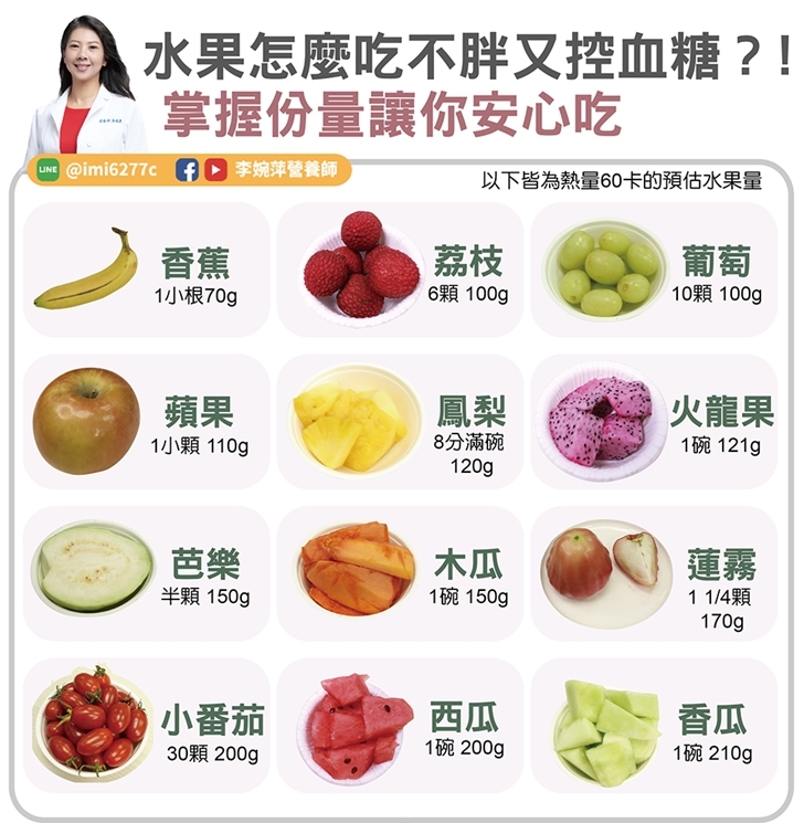 李婉萍營養師建議掌握「一份水果」的量,一天吃2至3份水果。一份水果怎麼算?是指60大卡,含有15克的碳水化合物,以下列舉常見12種水果的「一份水果量」供糖友參考,方便每日更換食用。
