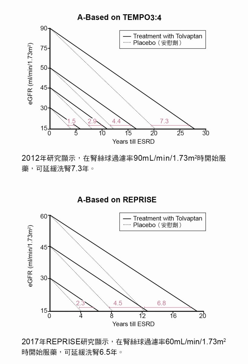 治療上已有一款藥物(Tolvaptan,中文名佳腎康錠)可使用,可延緩多囊腎的病程發展、延後洗腎時點,且自慢性腎臟病第三期起有健保給付,但民眾可能遇到有些醫師建議第二期開始自費服藥,以達「及早預防」的好處,其中牽涉的考量甚多,請看以下分析: