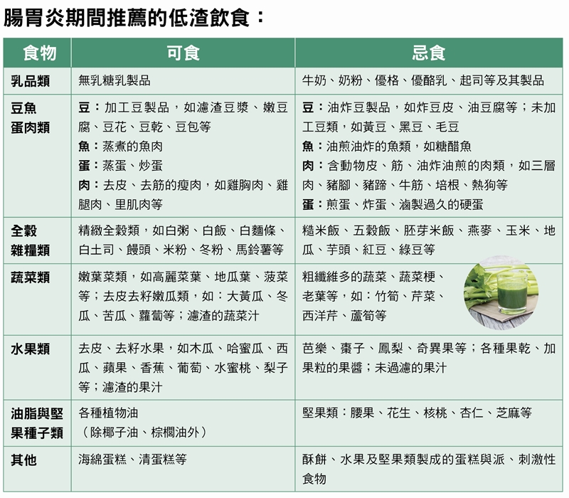 彰化基督教醫院營養暨膳食部營養師沈佩盈表示,腸胃炎期間適合「低渣飲食」,減少食物消化後於腸胃道留下的殘渣,藉此降低糞便體積、減少腸胃刺激,讓發炎的腸胃休息。