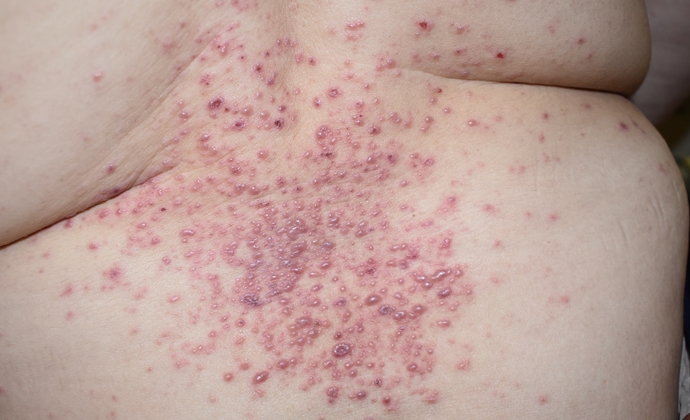 61歲的王女士患糖尿病及高血壓多年,日前胸壁右側出現多顆疼痛性水皰,隔天又於腹背、四肢、頭皮、嘴唇及口腔內發現更多水皰,有些水皰破裂成傷口,有的乾掉結痂。她到奇美醫院急診,醫師診斷為「瀰漫性帶狀疱疹病毒感染」,立即安排住院接受全身性抗病毒藥物治療,約一週後多數水皰結痂掉落,疼痛獲得改善……