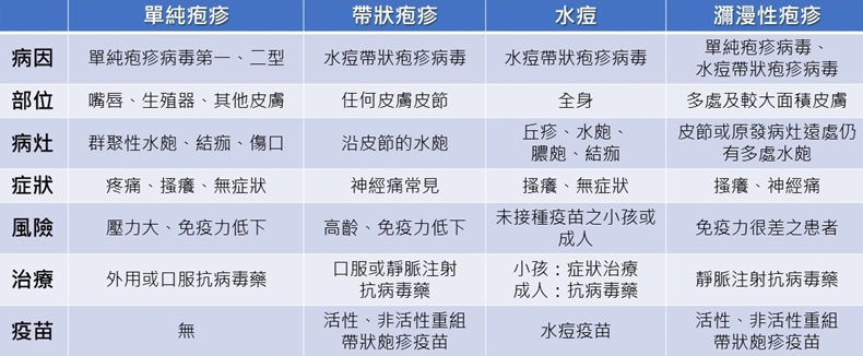 單純疱疹、帶狀疱疹、水痘、瀰漫性疱疹比較表